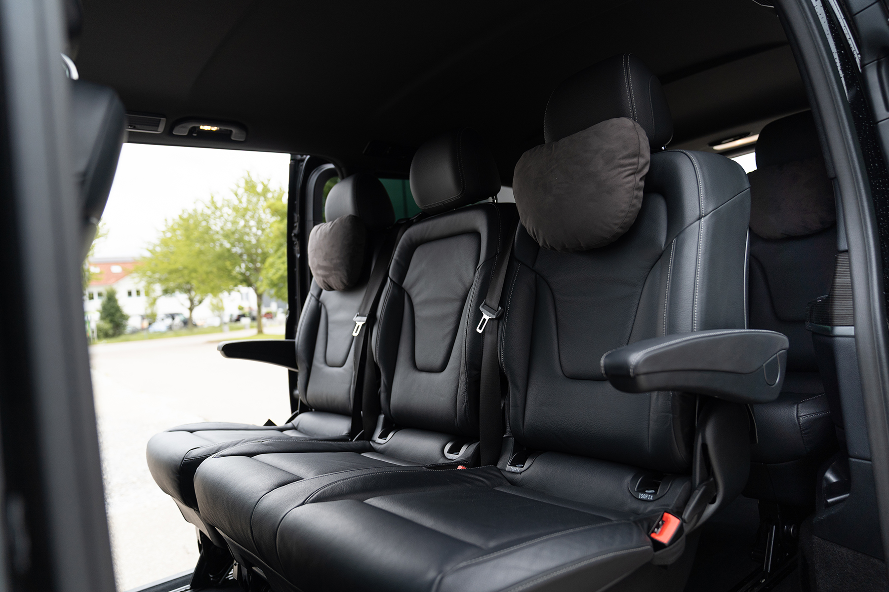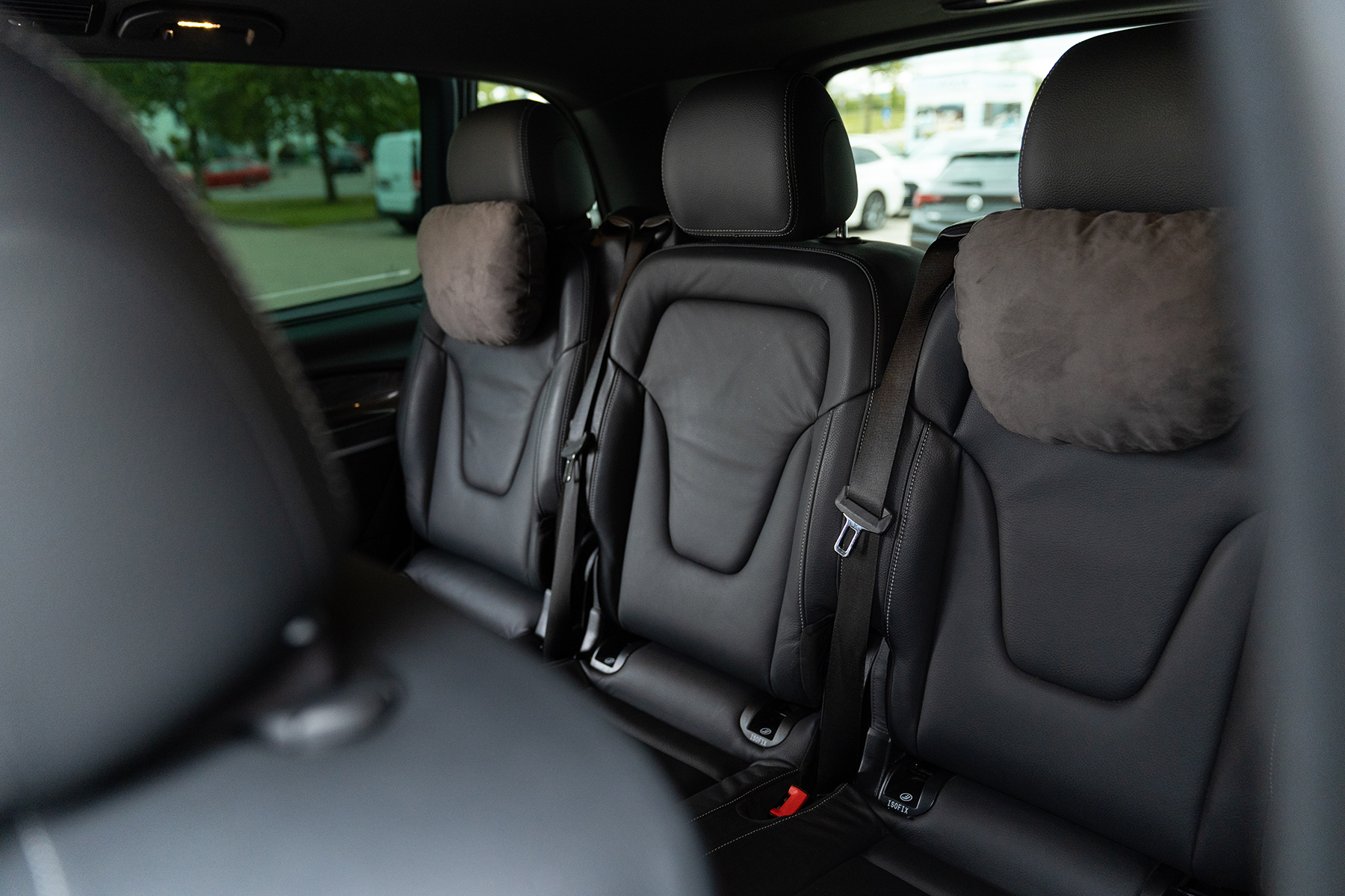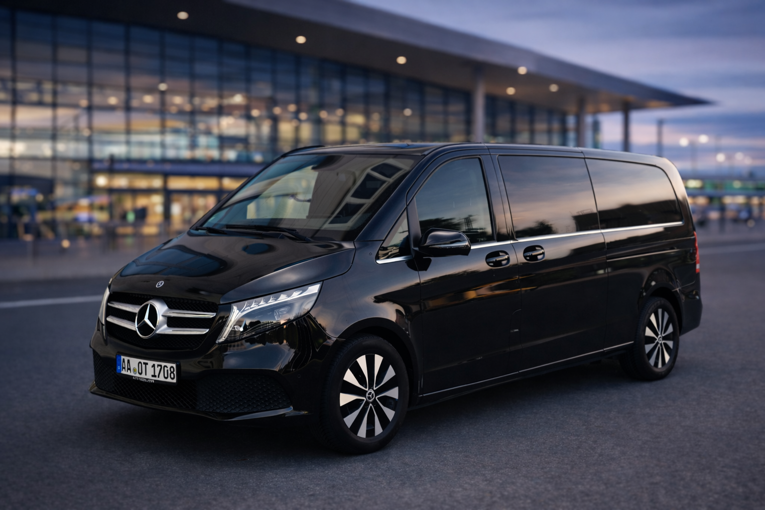 Unsere Mercedes-Benz V-Klasse bietet Platz für bis zu 7 Fahrgäste und eignet sich ideal für Gruppenfahrten, Familien oder Geschäftsteams. Mit großzügigem Innenraum, bequemen Sitzen und hochwertiger Ausstattung genießen Sie höchsten Komfort – auch auf längeren Strecken.